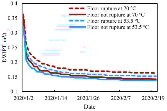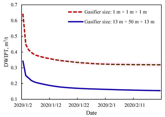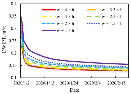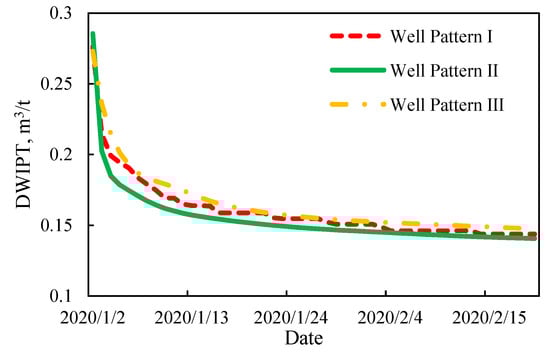 In Figure 7a,c, the injection well is located below the production well, ensuring gasification safety. Due to gravity, coal seam water will migrate to the low-lying area in the gasification process; thus, the gasification cavity, with a high capacity to deal with coal seam water influx, should be arranged at the lower part of the coal seam. For the first gasification cavity, the overall temperature is low, and the ability to deal with coal seam water influx is low. After a period of gasification, the temperature in the gasifier increases, strengthening the ability to deal with more coal seam water by evaporation. Therefore, the moving direction of the gas injection point should be along the downward dip direction of the coal seam. The daily water inflow per ton (DWIPT) of the three different well patterns above are simulated, and the results are shown in Figure 8.