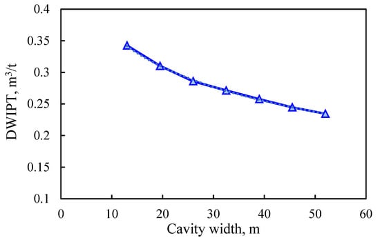 According to Figure 10, at any time, the smaller the cavity width, the larger the water inflow. This suggests that the groundwater influx becomes more harmful the smaller the cavity, particularly at the initial moment of gasification. Figure 11 shows that there is a logarithmic relationship between water inflow and cavity width: