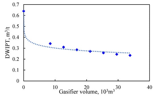 As shown in Figure 14, the relationship is correlative and falls in the range of variability of the gasifier volume from 1 m3 to 33.8 (1000 m3), which can be expressed by a logarithmic equation: