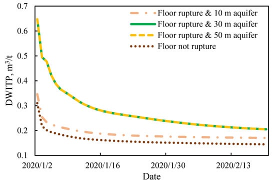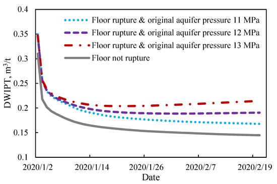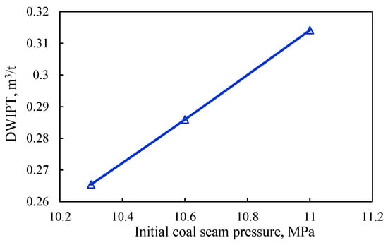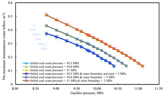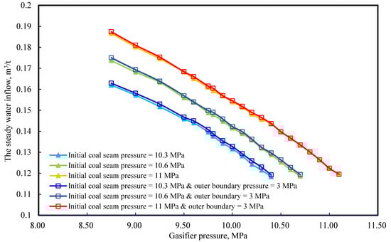 Therefore, it is necessary to study the water inflow under different injection–production pressures and to explore the effect of injection–production pressures on water inflow to ensure the safety of the gasification process. The injection pressure is set as 11 MPa and the production pressure is changed to explore the effect of production pressure on the water inflow (Figure 15).