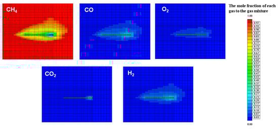 The migration displacement of CH4, CO, and H2 in the ideal model and the actual geological model were simulated for the case that the injectional–production pressure difference was 2 MPa and the aquifer above the coal outcrop was considered (Figure 32).