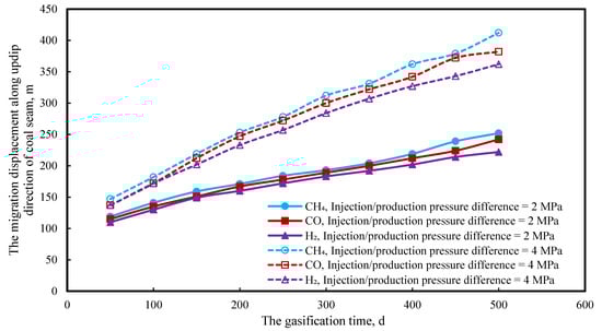 With increase in the injection–production pressure difference, in the same gasification time, more gas will migrate upward along the coal seam. That is, when the injection–production pressure difference is larger, the gas migration rate along the up-dip direction of the coal seam will be faster. When the injection–production pressure difference increases from 2 MPa to 4 MPa, the gas migration velocity doubles.