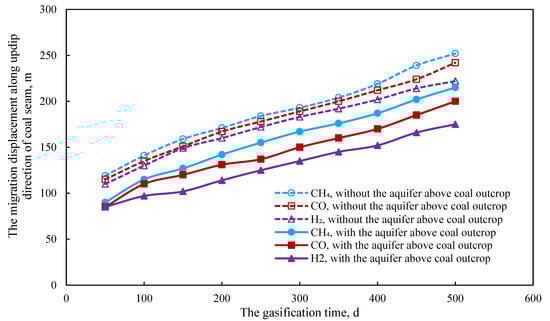The migration displacement of CH4, CO, and H2 changes by gasification time when the aquifer above coal outcrop is considered.