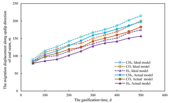 The migration displacement of CH4, CO and H2 changes by gasification time for ideal model and actual model.