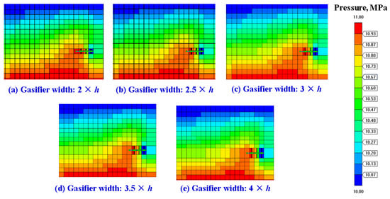 The gasifier widths were set to be 2, 2.5, 3, 3.5, and 4 times the thickness, respectively. The pressure distribution of different gasifier widths is shown in Figure 34. Different colors represent different formation pressures. The number on the right side of the color palette represents the pressure range for each color in MPa.