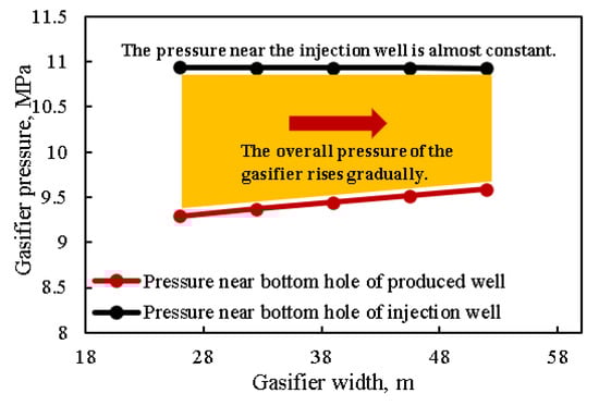 It can be seen that with the gasifier width increasing, the pressure near the injection well is basically unchanged, while the pressure near the production well gradually increases. It is also implied that the pressure near the production well changes more significantly than the pressure near the injection well. The overall gasifier pressure rises with gasifier width increases; the correlation between them is expressed as the following equation: