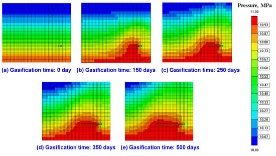 In the field, the pressure extends first along the width of the gasifier, and then along the length direction of the gasifier. The process is repeated until gasification is completed. A reasonable determination of gasification pressure is of great significance to the control of water influx and gas migration in the gasification process [35].