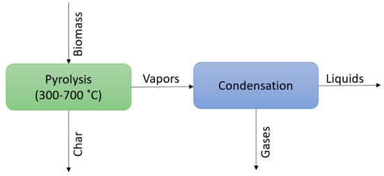 Several biological conversion systems (fermentation and anaerobic digestion) and thermochemical conversion processes (gasification, pyrolysis and liquefaction) can be applied to convert biomass feedstocks to fuel and chemicals. Among these processes, biomass pyrolysis has recently received much attention. Pyrolysis can produce a wide range of gas-, liquid- and solid-phase products (Figure 1) [15,16]. The solid product from pyrolysis is referred to as biochar. It is a porous, carbon-rich substance gained from thermochemical pyrolysis of biomass materials with little or no oxygen. Biochar could be used for several applications, such as fuel, in the preparation of activated carbon for wastewater treatment, for soil modification, and as a catalyst for industrial applications [17,18].
