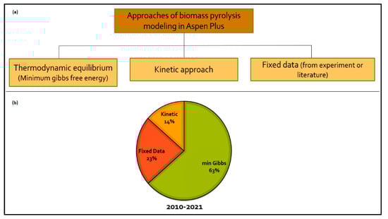 A categorization of biomass pyrolysis modeling types by Aspen Plus, (a): categorization of Aspen Plus biomass pyrolysis modeling approaches, (b): contribution of Aspen Plus biomass pyrolysis modeling approaches in the literature.