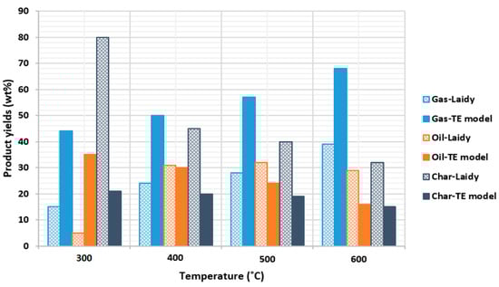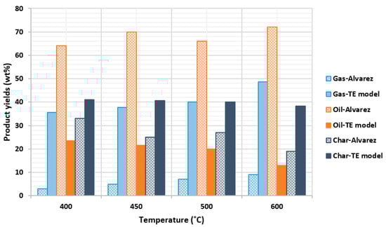 In this subsection, the product yields calculated with the TE simulation model developed in this paper are compared with the experiment values achieved by Alvarez et al. [61]. In this paper, rice husk has been entered into a pyrolysis unit operating under atmospheric pressure and various temperatures. The main rice husk properties are summarized in Table 3. Four different temperatures were considered, and the comparison of product yields is provided in Figure 5. Noticeably, the deviation of the model results from the experimental data is high for all cases. It is evident that the Aspen Plus simulation model based on TE approach for biomass pyrolysis cannot be in an agreement with the experiment outputs. However, to be sure about this matter, other experimental results should be considered for comparison.