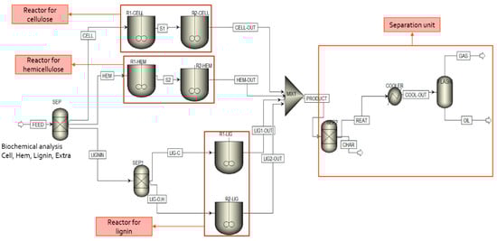 Figure 7 shows the Aspen Plus flowchart of the biomass pyrolysis process using the kinetic method developed in the present paper. The FEED/BIOMASS stream is a non-conventional material that is defined by utilizing the biochemical analysis of the biomass (e.g., wt% of cellulose, hemicellulose, lignin and extra components). Thus, the required inputs for this part contain the biochemical analysis of biomass feedstock as well as inlet temperature and pressure, which are set to 25 °C and atmospheric pressure, respectively.