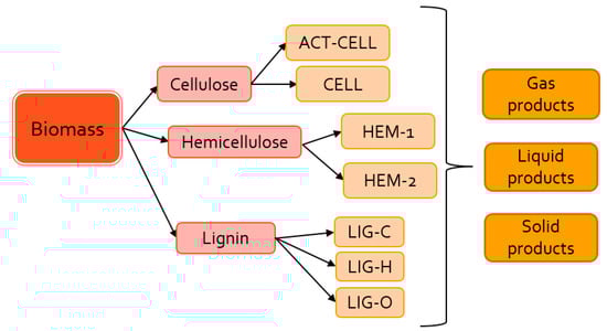 To overcome these challenges, some modeling strategies are applied. Three sets of reactors were considered for individual reactions of cellulose, hemicellulose and lignin. In this way, several reactions can be defined. The mass balances can now be solved correctly, and outputs related to each part can be easily evaluated individually. The chemical reactions considered for these parts are taken from the literature (Table 8) [64,65,66]. The reaction structure for biomass pyrolysis is shown in Figure 8. First, cellulose, by considering the kinetic parameters, is divided into two streams of activated cellulose (ACT-CELL) and cellulose (CELL), and for the reactions of each, one CSTR reactor has been simulated. The same is conducted for hemicellulose (Hem-1 and Hem-2). Lignin is divided into a LIG-C, LIG-H and LIG-O stream, and two series of reactors are defined, one for LIG-C and one for LIG-H and LIG-O reactions. At the next step, all the reactor outputs are combined in a mixer, after which, char and ash are separated from the rest of the products. Afterward, the REST stream containing liquid- and gas-phase products (i.e., bio-oil and syngas) are separated from each other by passing through a cooler and a flash separator (both operating at atmospheric pressure and 20 °C). Finally, molar and mass flow rates of biochar, bio-oil and syngas are the simulation outputs, and, using Equations (1)–(3), the product yields for each system can be calculated.