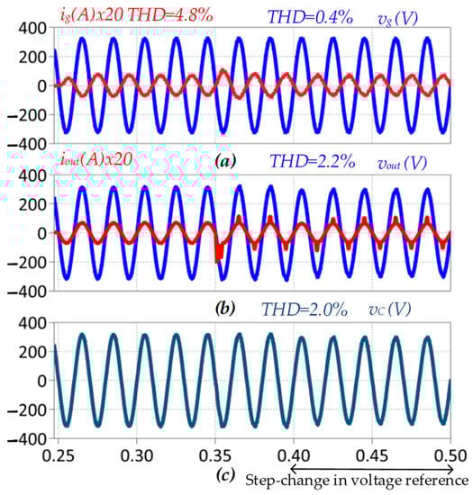 | Step change in reference from 230 V to 210 V with kout = 0.2 and kc = 0.8 | Grid current ig | 4.8 |