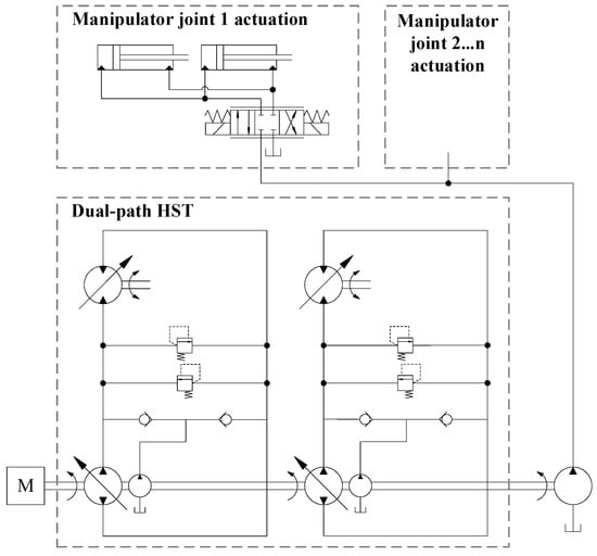 14]. The hydrostatic transmission (HST) consists of a single diesel engine and separate hydraulic circuits for each track driving wheel. This configuration is called a dual-path HST. In each of the circuits, there is a variable displacement hydraulic pump connected to a variable displacement hydraulic motor. An implement pump is included in the system to provide the onboard manipulator with hydraulic flow.