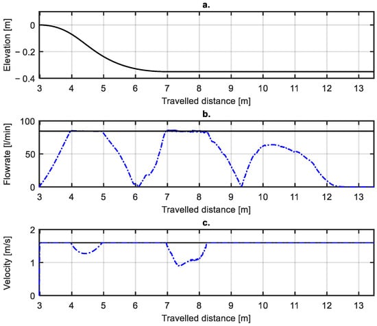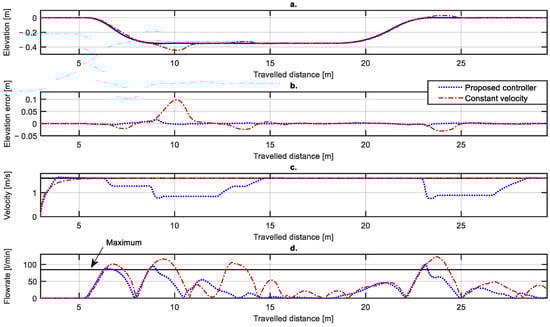 Figure 7d). The constant travel velocity test shows that the flowrate requirement clearly exceeds the available rate on four occasions. This causes noticeable errors in the blade elevation, as most clearly seen at 10 m, where the blade is 0.1 m below the desired elevation. Further errors are caused as the mobile base drives over the unintended error as illustrated from 13 to 16 m. The velocity profile in the velocity-limited case is achievable by the vehicle, although fast deceleration happens at 23 m. The acceleration limit keeps the required velocity constant during the parts mentioned in