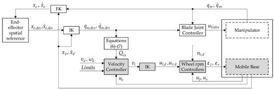 2]. In these functions, the operator typically selects the vehicle travel velocity manually. However, the Cartesian velocity of the machine itself and the onboard manipulator are limited by the available hydraulic flow to the corresponding actuators.