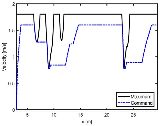 Figure 8 illustrates the maximum velocity computed using (14) without considering the desired velocity. This showcases the upper limit imposed by the HST from Equation (13). This functionality allows the machine to follow the desired mobile base paths, straight or curved, with high accuracy. For brevity, such cases are left out of this paper. The command velocity is shown in