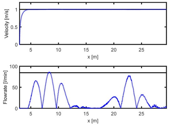 x-axis is selected as distance to make comparing the scenarios easier. The desired velocity was set to 1.6 m/s and the diesel engine rpm was selected in the middle of the operating range as 1500 rpm to showcase the velocity controller functionality. The manipulator flow requirement was the minimum in Equation (14), as the mobile base velocity did not cause the requested HST flowrate limit to be reached in this scenario. The desired ground profile for the blade is seen in