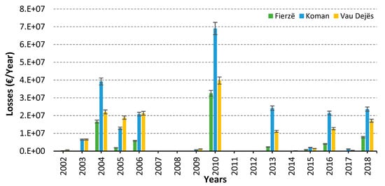 Level of potential financial losses (EUR/year) in the Drin River cascade, during 2002–2018.