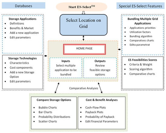 The methodology for selecting the appropriate type of ESS depends on the model, which must necessarily include the possibility of integrating different forms and types of storage technologies into the energy system, including generation, transmission, distribution, as well as final consumers []. Comparing and then choosing the right energy storage systems is a very complicated procedure as it is closely related to a wide variety of operational and business factors such as differences in deliverable power, efficiency, discharge time, life cycle, the number of applications that the systems can be applied to, financial parameters, and the ability to monetize multi-application benefits; hence, the Energy Storage Select software (ES-Select™) is a decision-support tool that helps users identify the most feasible energy storage technology options, considering the chosen country context. ES-Select™ is a sophisticated, highly interactive model that offers a means to carefully analyze the many interrelated factors that influence the overall feasibility scores of ESSs given in a graphical presentation. It ranks them for the selected application (s) chosen. The model uses a Monte Carlo-based analysis to handle uncertainties in cost, benefit, life cycle, efficiency, discharge duration, and other influenced parameters. The model also enables the users to change energy storage and application data. The methodology followed in the evaluation is explained in detail in the flow diagram (Figure 3).