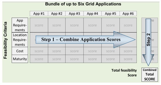 where S1, S2, and S3 represent the average feasibility scores and “n” is their number. The main difference between the two methods is that lower numbers have a higher impact on reducing the geometric mean than the arithmetic mean. For example, a single “zero” result may lower the arithmetic mean slightly, but the geometric mean leads to zero. When a storage option calculates zero points for any of the feasibility criteria, then this means that the ESS cannot provide the list of services; therefore, it may not be an acceptable technical solution, and this shortcoming should be reflected in the combined feasibility score. As a result, the geometric mean is preferred for combining multiple feasibility results. ES-Select uses the following geometric mean Equation, Equation (3) [].