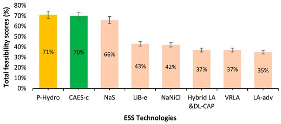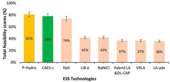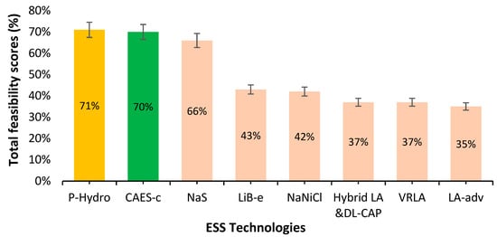 Suppose different specific weight factors are applied in the system. Different results are expected to incur in terms of total feasibility scores collected by each ESS technology suggested by the model. In the case of choosing a weight factor of 1.5 that meets service applications, as given in Table 1, the total feasibility scores change to 70% for PHES and CAES-c. NaS collect 69% and 68%, respectively. The other technologies survive a slight increase of 2%. In the case when the weight of the factor of meeting applications in the requirements list, installation location, and total cost (USD/kW) increases from 1 to 1.5 and considering factor 1 for the maturity requirement, then higher feasibility scores are given to the mechanical storage form piling up equal scores of 69% (CAES-c) (PHES). Na-S reaches 64%, while the other batteries get values ranging from 32% to 42%. Figure 6 shows the total feasibility scores for the ALCM criteria.