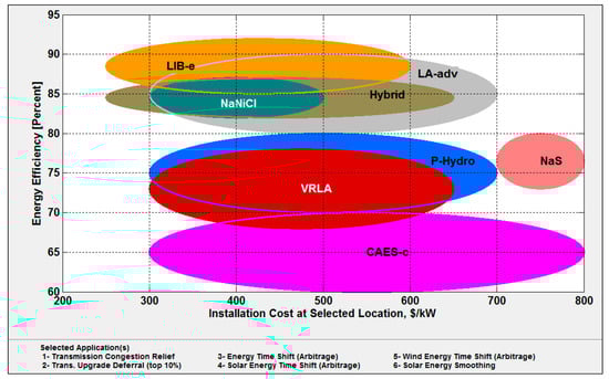 Energy efficiency (%) of different ESSs as a function of installation cost (USD/kW) at the selected location.