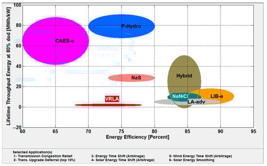 Lifetime throughput Energy at 80% dod (MWh/kW) as a function of efficiency (%) for different types of ESSs.