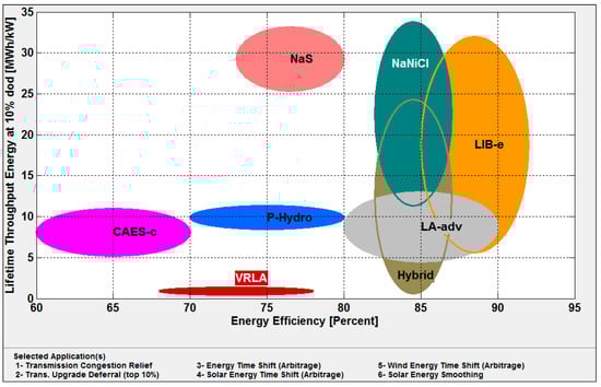 The more often a battery is charged and discharged, the shorter its lifespan. Complete (100%) discharge of batteries is generally not recommended. From engineering practice and studies by various authors in the field, it is shown that complete discharge rapidly degrades the energy conservation system, reducing its lifespan []. It is usually preferred to have this carried out to a certain extent, as recommended by their manufacturers. From Figure 10, it is shown that the mechanical ESS of CAES-c and PHES types can provide lower lifetime throughput energy at 10% dod (MWh/kW). At the same time, the electrochemical ESS group (battery), such as NaNiCl and LIB-e, has higher efficiency.