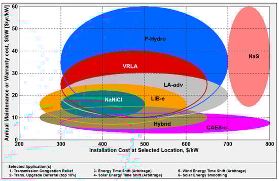 The commercial availability, benefits, real requirements, barriers, and limitations of (ESS) applications concerning two important sections, namely: basic generation, transmission, and distribution, are assessed in the country context [,]. The following section summarizes the key requirements for each selected application and how specific ESS technologies can meet them. The focus is on technical and economic requirements as well. The selection strategy considers the price and cost of components according to their normal distribution, evaluating all possible ESS options, which identifies and selects one or several optimal alternatives. The selection of the application location is of particular importance as it directly affects three critical factors such as:
