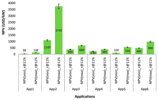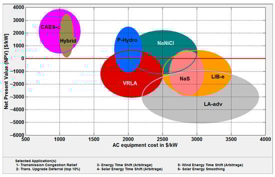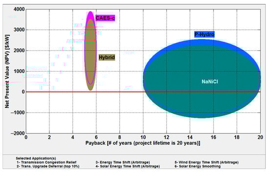 As shown in Figure 12, the CAES system provides higher NPV values for the given application list. Moreover, hybrid battery systems can provide comparable NPV values versus CAES-c systems. At the same time, the PHES system and NaNiCl batteries have an NPV that falls at an uncertainty zone that varies from negative to positive values. Although all other technologies fell into a negative area, these technologies are not competitive and are excluded from the calculations.