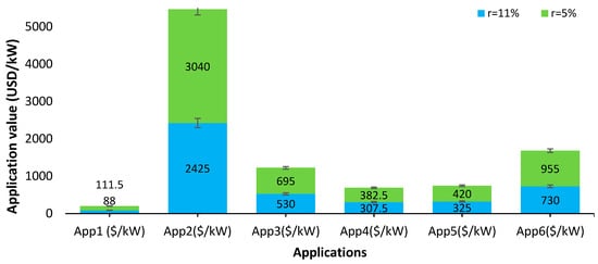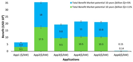 The following supporting information can be downloaded at: https://www.mdpi.com/article/10.3390/en15114032/s1, Figure S1: Application values (Present worth) (USD/kW) in 10-year frame time for the chosen applications list (App1→App6) and discharge duration (hours) at a discount rate of 11%; Figure S2: Application values (Present worth) (USD/kW) in 10-year frame time for the chosen applications list (App1→App6) and discharge duration (hours) at a discount rate of 5%; Figure S3: Application values (Present worth) (USD/kW) in 10 years frame time for the chosen applications list (App1→App6) and Total Benefit Market Potential (USD billion) at a rate of 11% of the discount rate; Figure S4. Application values (Present worth) (USD/kW) in 10 years frame time for the chosen applications list (App1→App6) and Total Benefit Market Potential (USD billion) at a rate of 5% of the discount rate; Figure S5: Present worth (USD/kW) over ten years for the chosen applications list (App1→App6) and Market Potential (103·MW) at a discount rate of 11%; Figure S6: Present worth (USD/kW) over ten years for the chosen applications list (App1→App6) and Market Potential (103·MW) at a discount rate of 5%.