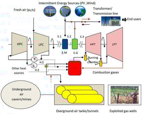 During the periods of low power demand, the surplus electricity can be used to drive a reversible motor/generator unit, which, in turn, can run a train of coaxial compressors to put air into a deposit, which is either an underground cavern, gas well, mine tunnel or overground tank. When the power generation cannot meet the load demand, the stored compressed air is given and heated by passing into heat exchangers (H.E) devices, a heat source that can be provided from fossil fuel combustion, or the heat recovered from the heat the compression process. The waste heat from the exhaust can be recycled by a recuperator unit (i.e., red box H.E). The compressed air energy is then captured by the turbines producing back electricity. Although CAES systems’ case, the compression and expansion phases are decoupled instead of simultaneous, CAES systems work under similar principles as conventional gas turbines. The energy is stored in high-pressure air, typically at a pressure of between 40 (bar) to 80 (bar).
