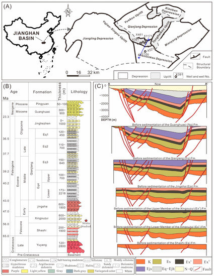 The Jianghan Basin is a Cretaceous-Oligocene rift basin with an area of ~28,760 km2, and is divided into five depressions and three uplifts [21,22] (Figure 1A). Rifting in the basin was caused by Pacific–Eurasia subduction and initiated during the Late Cretaceous period [23,24]. Since the Paleogene, the basin has experienced two rifting stages caused by the India–Eurasia collision [25].