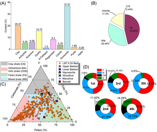 Mineralogical and lithofacies characteristics of the LXF II Oil Bed in the Jianghan Basin. (A) The proportion of main minerals. (B) Types of clay minerals. (C) Ternary diagram of lithofacies division; data for comparison taken from [28,29]. (D) The proportion of various lithofacies in different intervals.
