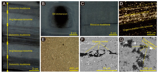 Core, thin section, and SEM images of the LXF II Oil Bed. (A) Dark gray laminated dolomitic mudstone and light gray massive argillaceous dolomite. (B) Oil immersion shown in argillaceous dolomite. (C) Gray massive mudstone. (D) Laminated mixed shale. Dark OM-rich laminae and light carbonate-rich laminae are observed. (E) Massive calcareous dolomitic shale. (F) Occurrence of solid OM in mixed shale. (G) Precipitated oil in matrix pores of calcareous dolomitic shale.