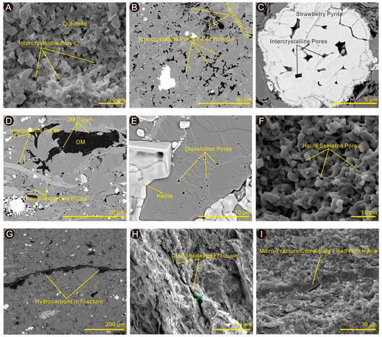 Shale pores not only provide space for hydrocarbon storage, but also form a flow-path network. Therefore, their size, type, and connectivity are essential for shale oil resource evaluation and development [33,34]. SEM images show that pores in the II Oil Bed are present in various types, having a wide range in morphology and size (Figure 5). Inorganic pores (intercrystalline pores, interparticle pores, and intraparticle pores related to the minerals) are dominant, with a few OM pores and micro-fractures (Figure 5). Dolomite grains are generally <2 μm and display perfect rhombic or sub-rhombic shapes (Figure 5A), and intercrystalline pores developed among them are the main reservoir space type (Figure 5B). Some intercrystalline pores are also developed in pyrite aggregates (Figure 5C), and these pores are interconnected. However, these aggregates are relatively isolated, and the pore size is small, so the oil in these pores may be difficult to extract. Interparticle pores mainly occur between clay platelets and detrital grains (Figure 5D). Intraparticle pores mainly include dissolution pores (Figure 5E) and halite skeleton pores (Figure 5F), and the former are usually related to the organic acids formed during hydrocarbon generation [35]. Only a few scattered OM pores were observed (Figure 5D). Since their formation is usually associated with hydrocarbon generation [1], the lack of OM pores may be the result of low maturity. Fractures can provide effective reservoir space, and can significantly improve fluid flow capacity. Therefore, they play an important role in shale oil exploration and development [36]. Many hydrocarbon-filled fractures can be observed, which serve as pathways for hydrocarbon migration (Figure 5G). In addition, clay shrinkage fractures were also observed, which were formed by the clay mineral transformation during diagenesis or low-grade metamorphism (Figure 5H), and some micro-fractures are now filled with halite (Figure 5I). Inevitably, however, fractures may also be caused by drying during sample preparation or dehydration after the core is collected to the surface [1].