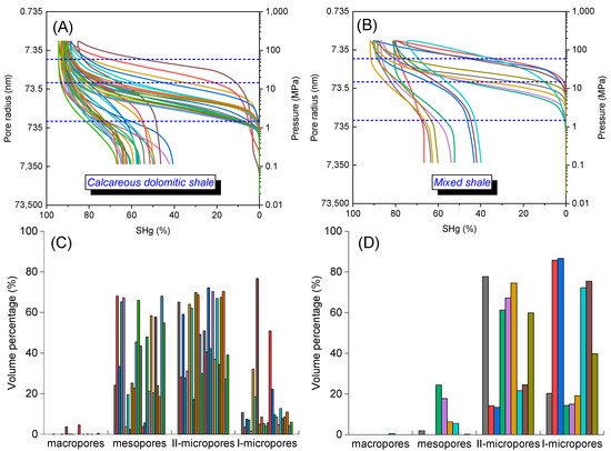 Mercury intrusion/extrusion curves of calcareous dolomitic shales (A) and mixed shales (B). Volume percentage of pores with different sizes in calcareous dolomitic shales (C) and mixed shales (D), macropores (>1000 nm), mesopores (100–1000 nm), II-micropores (25–100 nm), and I-micropores (<25 nm).