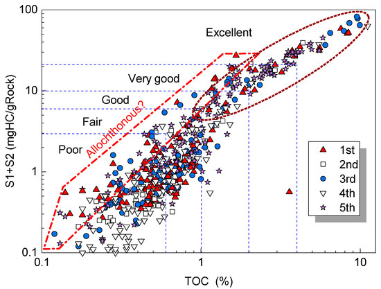 Cross-plot of S1 + S2 vs. TOC (after [37]).