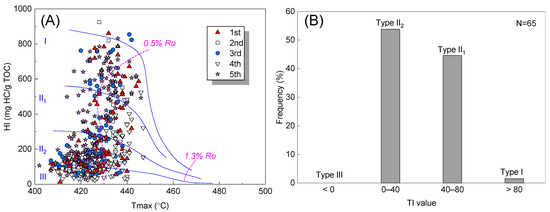 (A) Cross-plot of Tmax vs. HI (after [38]). (B) Frequency distribution of TI (type index), TI = 100 × (sapropelinite, %) + 50 × (liptinite, %) − 75 × (virtrinite, %) − 100 × (inertinite, %), and TI > 80, 80 > TI > 40, 40 > TI > 0, and TI < 0 indicate Type I, Type II1, Type II2, and Type III, respectively.