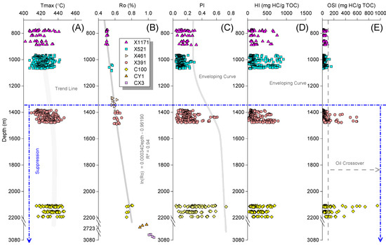 Geochemical profiles of wells with different buried depths. PI = S1/(S1 + S2); HI = S2/TOC × 100; OSI = S1/TOC × 100. (A) Tmax vs. depth plot shows that Tmax are suppressed below 1350 m. (B) Ro vs. depth plot shows that Ro increases with burial depth. (C) PI vs. depth plot, PI = S1/(S1 + S2). (D) HI vs. depth plot, HI = S2/TOC × 100. (E) OSI vs. depth plot showing obvious oil crossover effect below 1350 m, OSI = S1/TOC × 100.