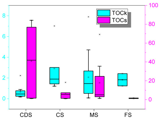 The kerogen organic carbon (TOCk) and the proportion of organic carbon in soluble OM to TOC of different lithofacies show that MS has a stronger hydrocarbon generation capacity than CDS. TOCk = TOC − 0.83 × extracts [48]. TOCs = 0.83 × extracts/TOC × 100%.
