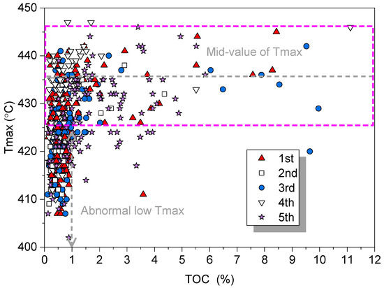 Tmax vs. TOC plot showing the existence of migrated hydrocarbons in the samples with TOC < 1%.