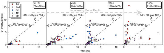Control of thermal maturity on oil content is revealed by plotting the S1 vs. TOC of wells with different burial depths.