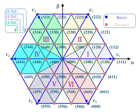 Reference [] proposes that when the sampling period is divided into three equal parts (N = 3), the discrete space vector modulation method can significantly reduce current harmonics and torque ripple, and there are 38 voltage vectors in total (6 effective voltage vectors, 2 zero-voltage vectors, and 30 virtual voltage vectors). The distribution of each voltage vector is shown in Figure 1.