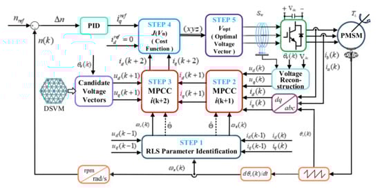 The control structure of RLS-DSVM-MPC is shown in Figure 3, where  = 0. The control structure includes modules, such as feedback measurement, coordinate transformation, PID regulation, RLS parameter identification, current prediction along with optimal voltage vector selection.