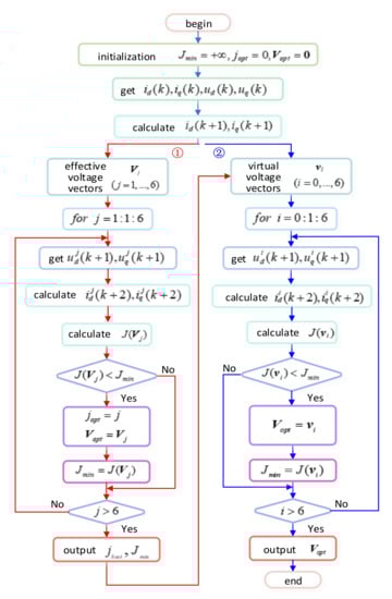 where  and  represent the expected current of d and q axes, respectively; is defined as the weighting coefficient;  represents the voltage vector;  represents the optimal voltage vector;  and  can be derived from Equation (2).