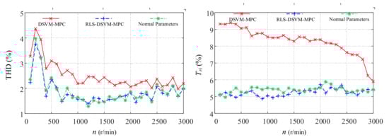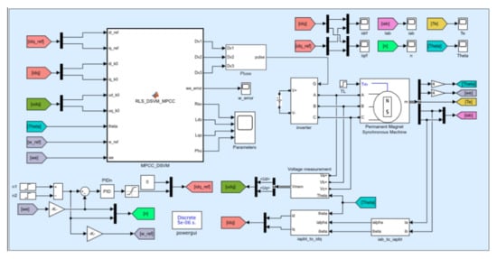 According to the control structure of RLS-DSVM-MPC, the simulation model was built with Matlab/Simulink, and it is shown in Figure 7. The parameters of PMSM are shown in Table 2. The PID parameters are given in Table 3. The sample time , the weighting coefficient , the RLS forgetting factor , the threshold , and the switching frequency of inverter was set to 20 kHz.