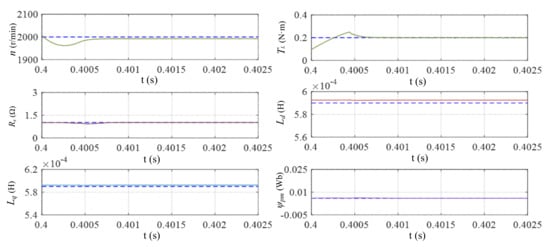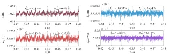 Figure 12, Figure 13 and Figure 14  show results of parameter identification in the PMSM. Figure 12 shows results when  and  changed from  to . Figure 13 shows results when  and  changed from  to . Figure 14 shows results when  changed from  to  and  changed from  to .
