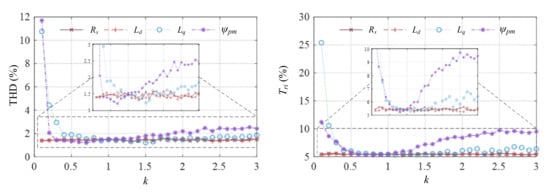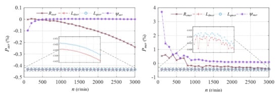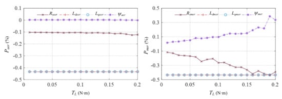 It can be seen from Figure 10 that the  of  () increases with speed, , , and  are little influenced by speed; the value of  and  are larger at low speed than at high speed, that means the parameter accuracy at high speed is higher than that at low speed. It can be seen from Figure 11 that the accuracy of parameters changes little as load increases. Comparing Figure 10 and Figure 11, we see that the identification accuracy of parameters are little affected by the load, and are greatly affected by the velocity.